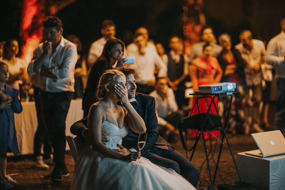 Anche in questo caso pensiamo a tutto noi: proiettore, maxi fondale e Mac per la postproduzione delle immagini e il montaggio video. Mentre sposi e invitati si godono le portate al tavolo, prepariamo e allestiamo tutto il necessario. Poi non resta che stupire ogni invitato con questo momento davvero speciale e molto emozionante per tutti.