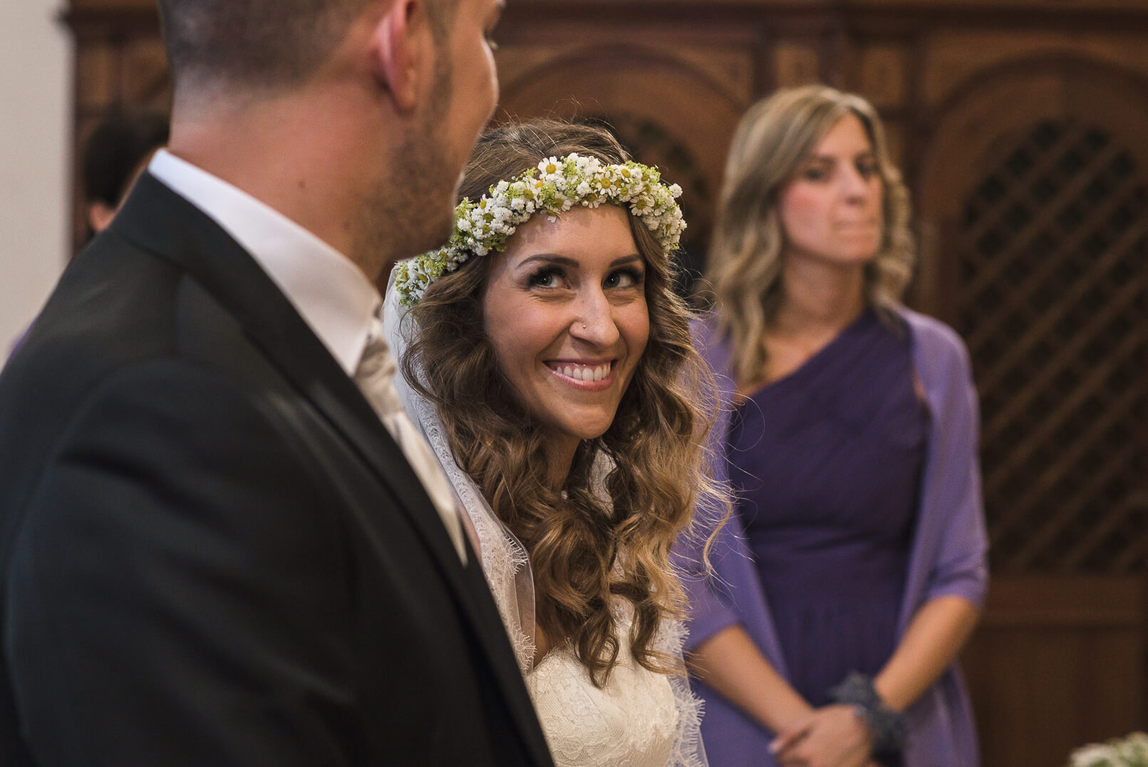 La sposa vive con gioia il momento di indossare il bellissimo abito, per raggiungere lo sposo che la attende emozionato all’altare.