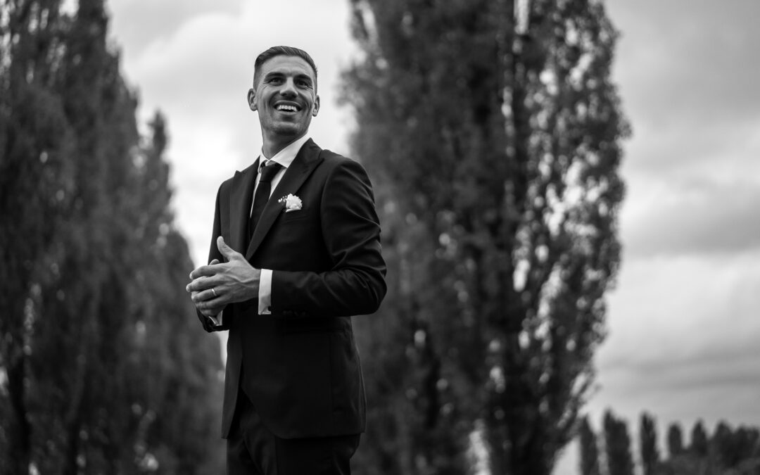 Durante il ricevimento, una foto che ci piace includere nell’album matrimoniale è quella dello sposo che guarda incantato la sposa, protagonista delle sue emozioni, valorizzato lui in tutta la sua eleganza e spontaneità. Proprio gli sguardi innamorati di lui diventano il centro dello shooting fotografico allo sposo e non possono mancare tra gli scatti top del ricevimento.