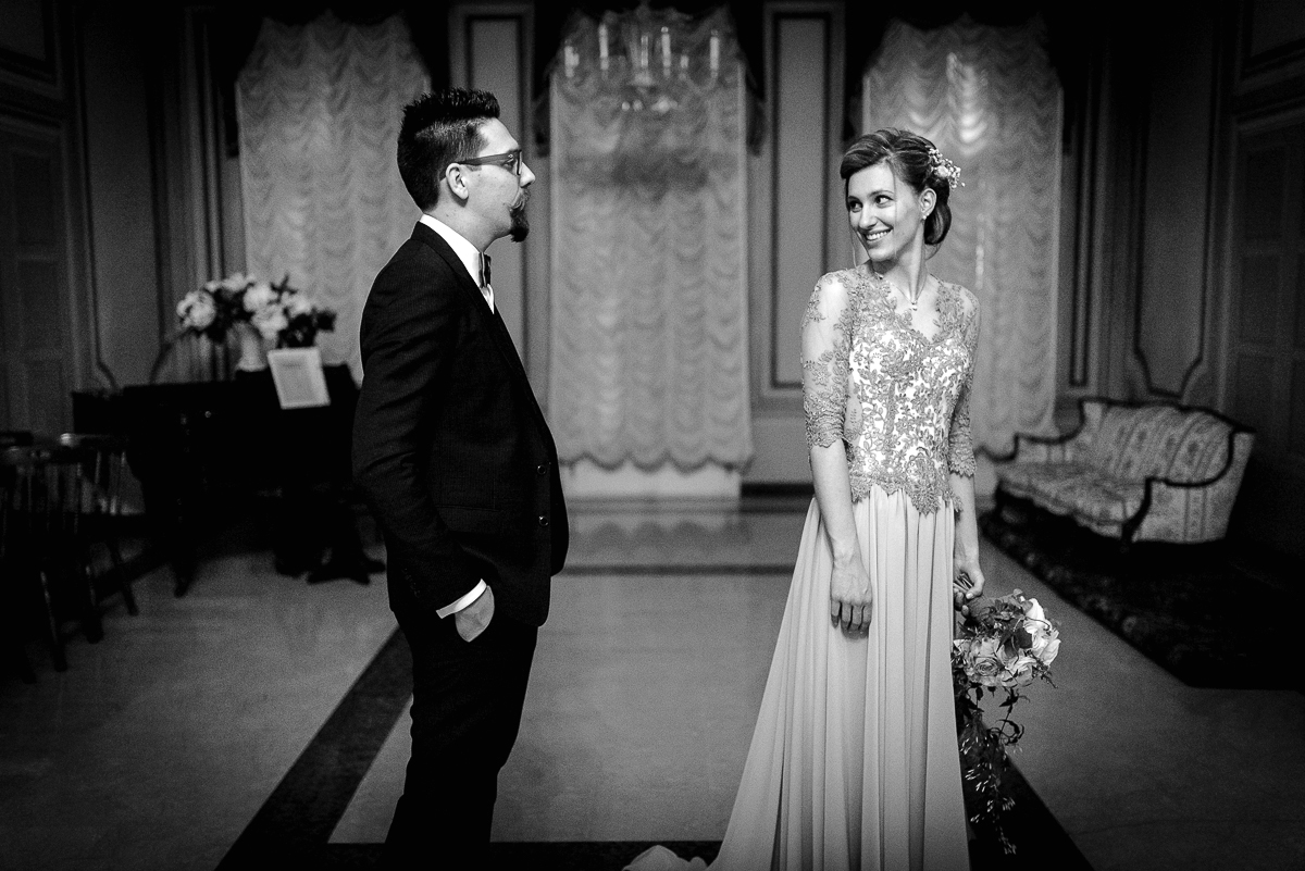 Per il rito civile siamo poi attesi nel bellissimo Salone degli Affreschi: lo stile ricco della Serenissima racchiuso in una sala elegante e raffinata, dominata da lampadari di cristallo e affacciata sul Parco. Qui le emozioni diventano sorrisi, lacrime, abbracci, istanti unici.