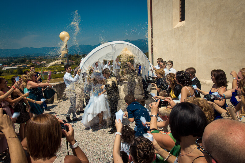 Una giovanissima coppia molto emozionata che ha scelto di celebrare il rito nella graziosissima Chiesa di Castello di Roganzuolo ci accoglie poi nella cornice di Villa Lucheschi. Il sole splende alto e la calura estiva ci permette di scattare poche foto all’arrivo al parco, verso l’ora di pranzo, ma recupereremo nel tardo pomeriggio supportati anche dagli amici degli sposi. Il paesaggio collinare si presta benissimo a delle foto all’aperto nel grandissimo giardino della location.